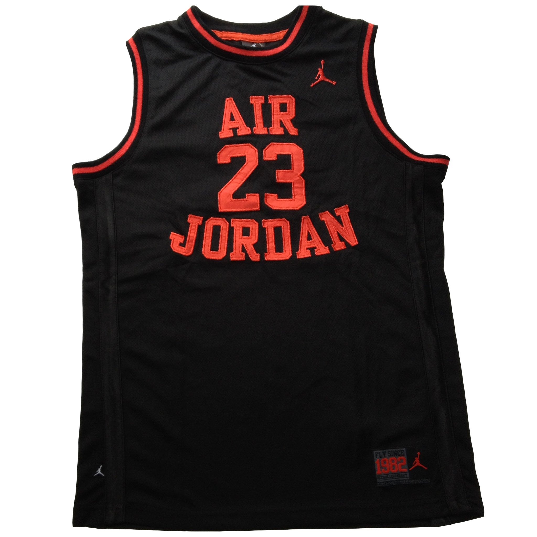 Boys/Youth Air Jordan #23 Basketball Jersey by Nike Black with orange lettering Sewn on letters and numbers on front & back Embroidered Jumpman logo on front "Jock Tag" on front bottom 100% Breathable polyester mesh fabric Striped trim on the neck and cuffs Retail: $ 45.00We Also Recommend