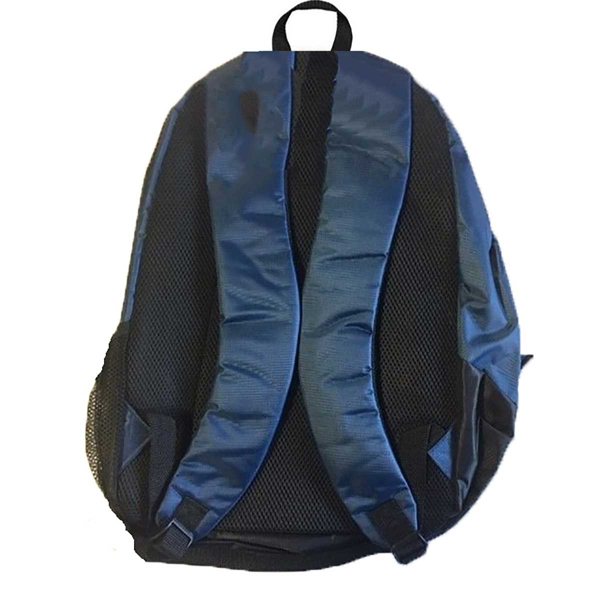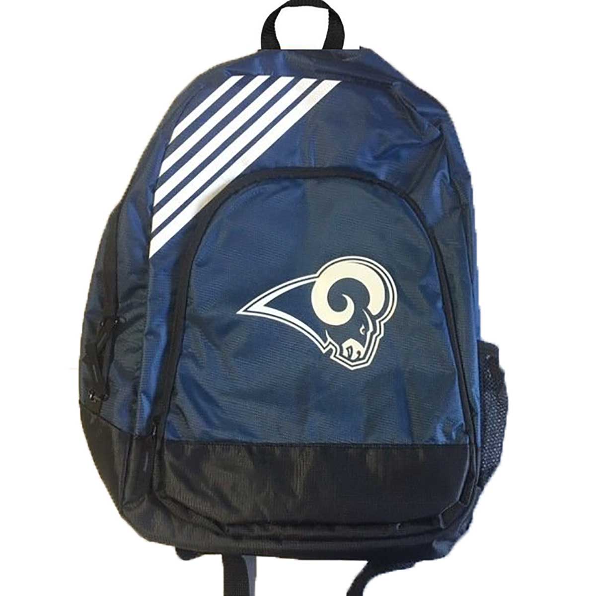 Officially licensed Los Angeles Rams back pack is blue with diagonal white stripes in the top corner and large white logo on front. Quality construction features two zipper compartments, mesh pocket, adjustable back straps, and top carry handle.