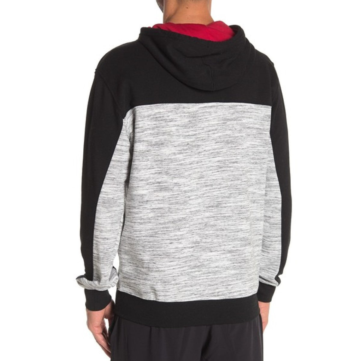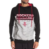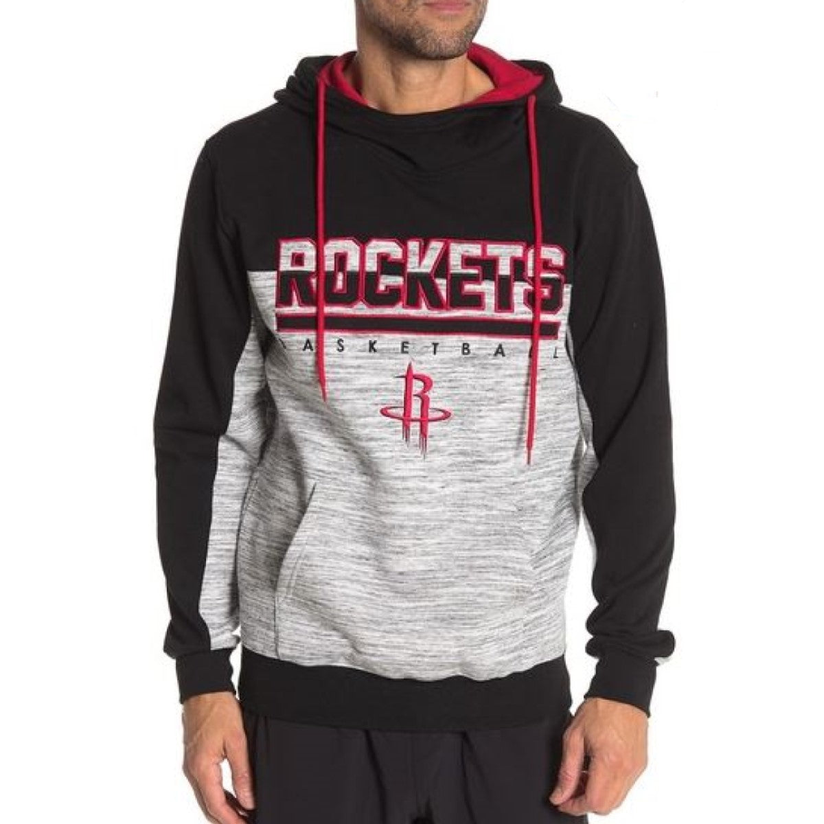 Houston Rockets hooded pullover is black with red lined drawstring hood & red trim. Bottom half of hoodie is gray space dyed. Team name and logo are embroidered.Pouch pockets.