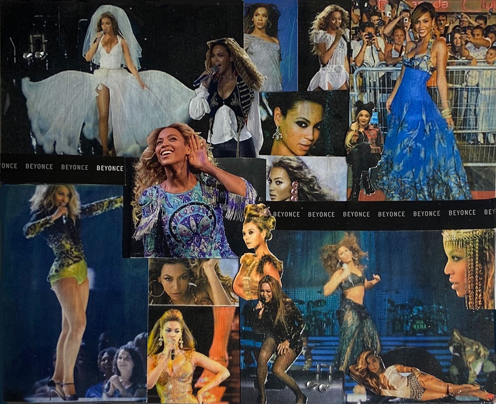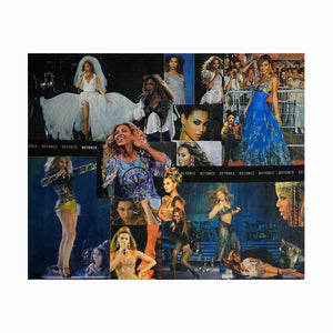 Handmade, one-of-a kind decoupage collage featuring Beyonce in 17 different poses. Collage is mounted on 8x10 canvas panel, ready to hang or frame.