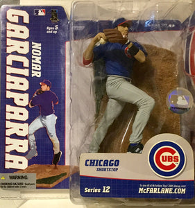 Nomar Garciaparra is sculpted as a Chicago Cubs Shortstop. This detailed figurine, made by McFarlane, has him wearing a blue jersey and gray pants