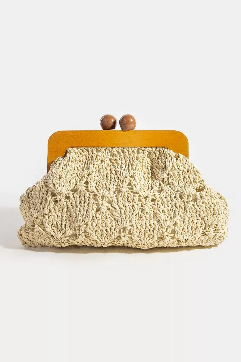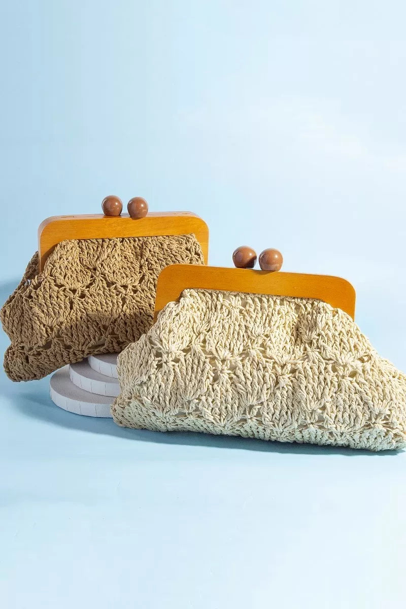 A straw braided wooden frame clutch bag is a stylish and unique accessory that combines natural textures with a touch of sophistication. The straw braided exterior adds a chic and summery vibe to the bag, while the wooden frame provides structure and durability. This clutch bag is perfect for adding a bohemian touch to your outfit and is ideal for both casual and more dressed-up occasions. With its compact size and sleek design, it can hold your essentials securely while keeping you stylish. Elevate your look with this trendy and versatile straw braided wooden frame clutch bag.