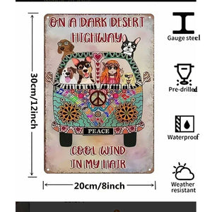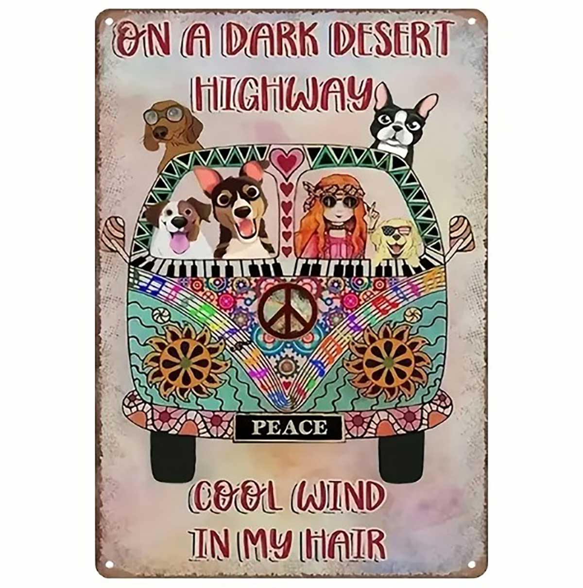Metal sign with cute graphic of van with peace signs and hearts, hippie and lots of puppies traveling to a festival "On a Dark Desert Highway, Cool Wind in My Hair". Edges have a vintage worn look, but are actually rolled under to give a smooth finish.