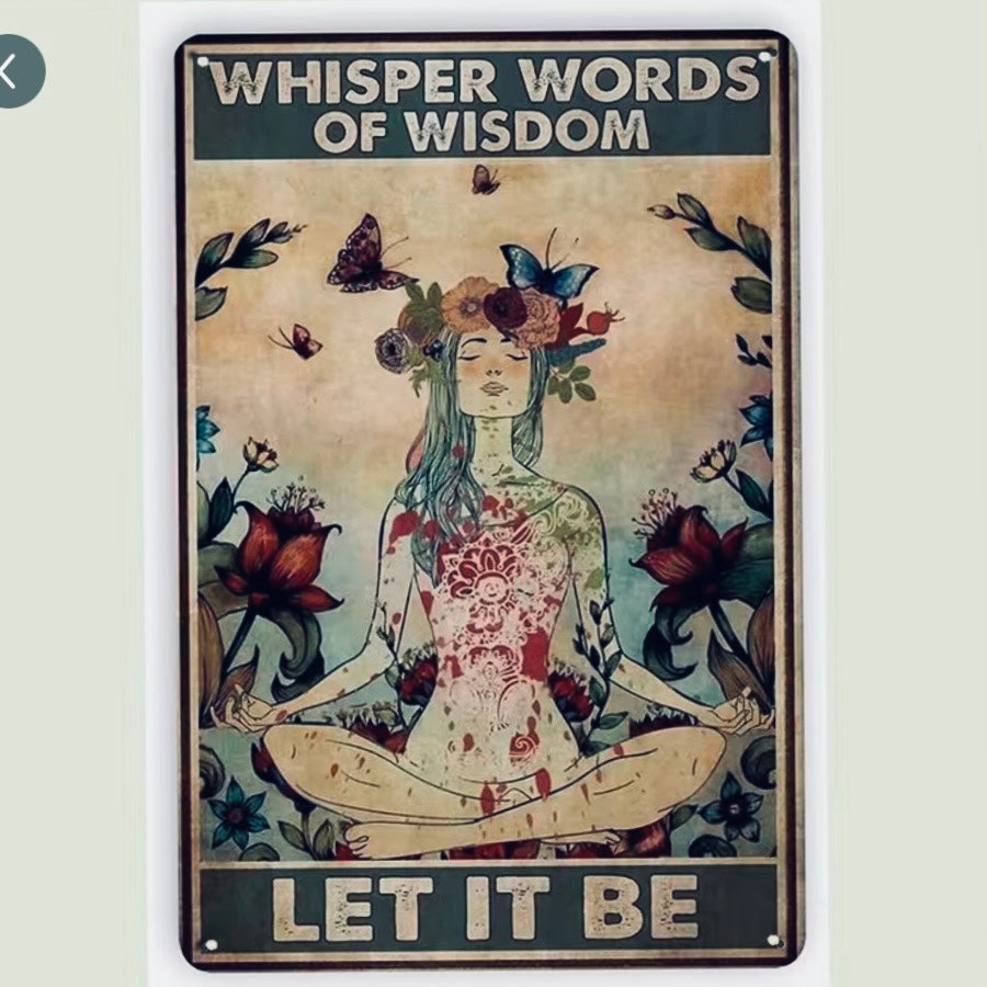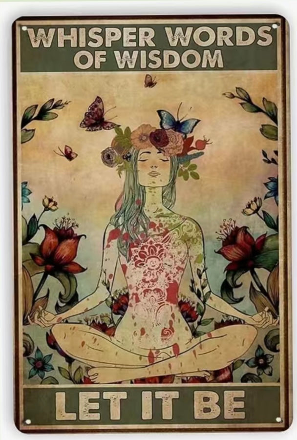 Metal sign celebrating the Beatles song "Let It Be”. This sign features a flower child with the words of the song above and belove. Edges are rolled under to give a smooth finish. Fade-Resistant for use inside or out. Lightweight with four predrilled holes for easy hanging..