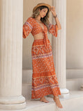 Top: A cropped, tie-front blouse with a plunging neckline and wide, elbow-length sleeves. The fit is loose and airy, providing both comfort and a flattering silhouette.