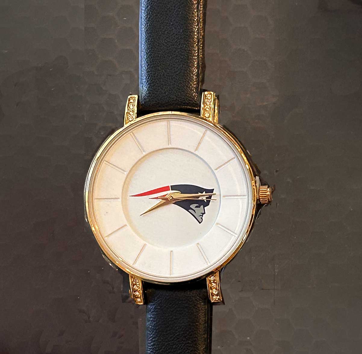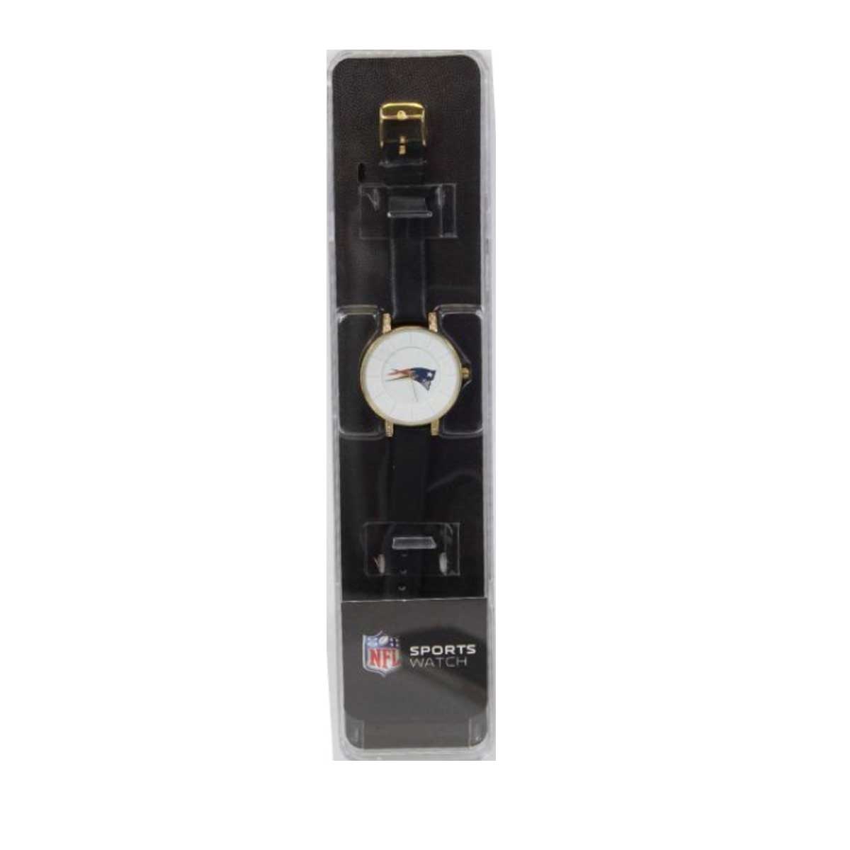 Show off your team spirit in style with this officially licensed New England Patriots women’s “Lunar” watch. This elegant timepiece features the Patriots flying Elvis logo on the dial, accented by a gold-tone bezel and hands with sparkling crystal details. A black poly leather strap with buckle closure provides a comfortable and sporty fit.