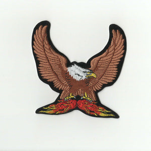 American Eagle perched upon flames embroidered patch. Iron or sew on to a vest, jacket, backpack or any other cloth item.