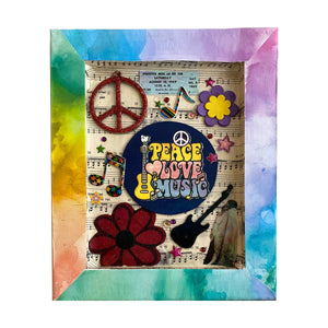 Handmade collage highlights the 1970's Woodstock theme of peace, love and music.