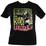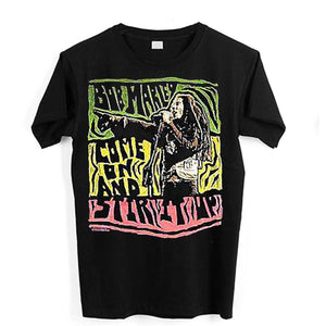 Printed in green, yellow and red, traditional rasta colors, this shirt has a funky, Jamaican design with Bob Marley at the microphone.