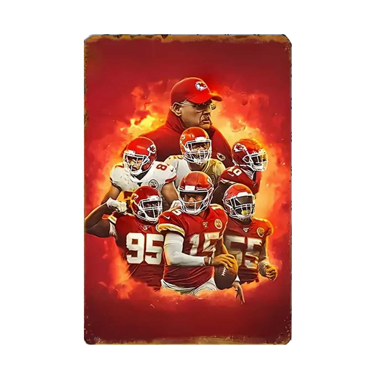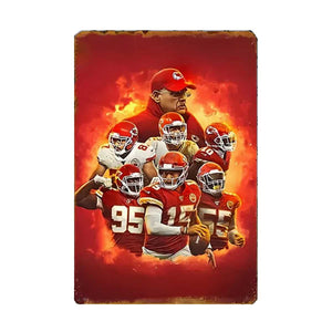Bring the winning spirit of the Kansas City Chiefs into your space with this vintage football tin sign. Featuring star players Patrick Mahomes, Chris Jones, Travis Kelce, and more, it's a perfect addition to any home, office, bar, or cafe. Waterproof and dustproof, it's also an ideal gift for any passionate sports fan.