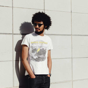 This Imagine Dragons t-shirt features a striking vintage-style graphic inspired by their album Night Visions. The design has a black-and-white woodcut look, depicting a mountainous scene with a bold yellow lightning bolt in the center. Above the graphic, "IMAGINE DRAGONS" is printed in a distressed yellow font, with “NIGHT VISIONS” in smaller text below it. Perfect for fans of the band, this shirt combines retro design with modern music flair.