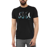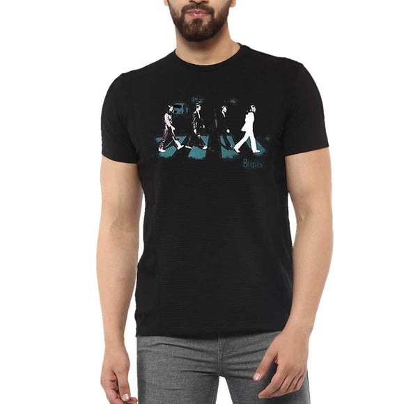 This black tee features a classic image of the Beatles crossing Abbey Road highlighted in gray. This shirt is copyright 2013 and does not appear to be worn (although it might have been). Extra soft material.