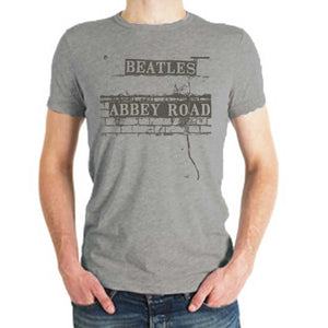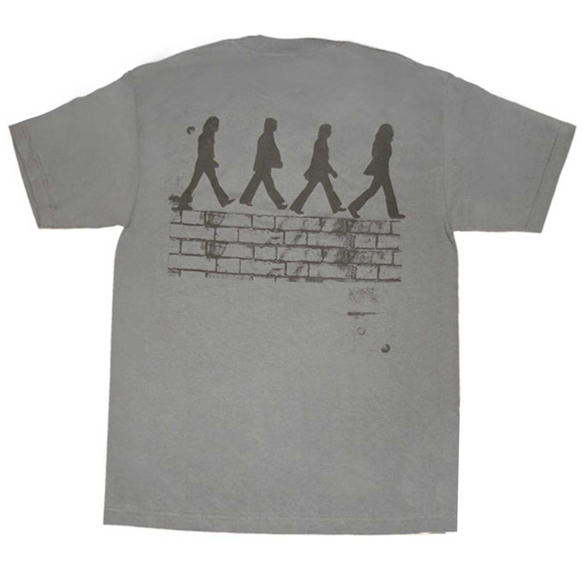 This vintage look t-shirt is printed on both the front and back. The front features a distressed brick wall with Beatles Abbey Road printed. The back has a silhouette of The Beatles crossing the road.