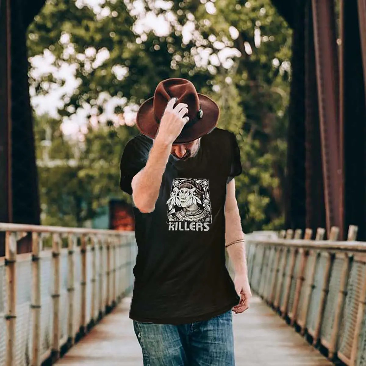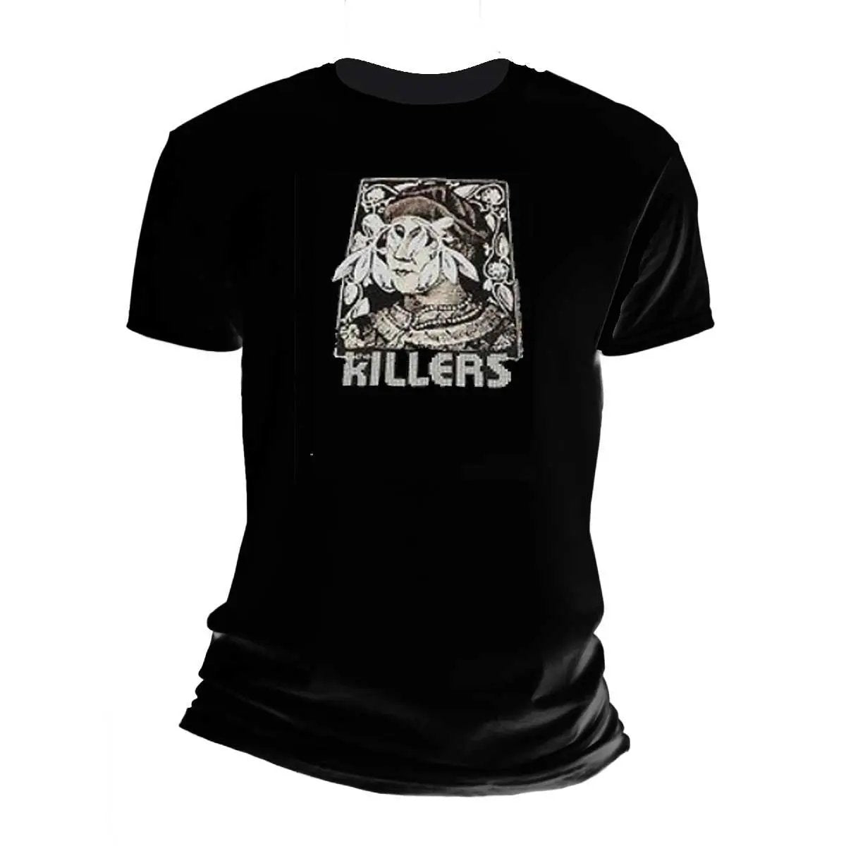 This stylish black The Killers T-shirt features a silk-screened blue bust engraved design on the front. The detailed artwork gives the shirt a bold and artistic edge, perfect for fans of the band or collectors of rock apparel.