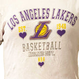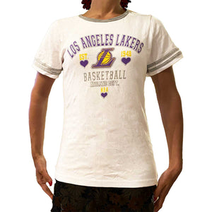 Womens white t-shirt with gray stripes on the short sleeves. Front features Los Angeles Lakers printed in purple with their logo in the center. Basketball Athletic Dept is printed in gray below.