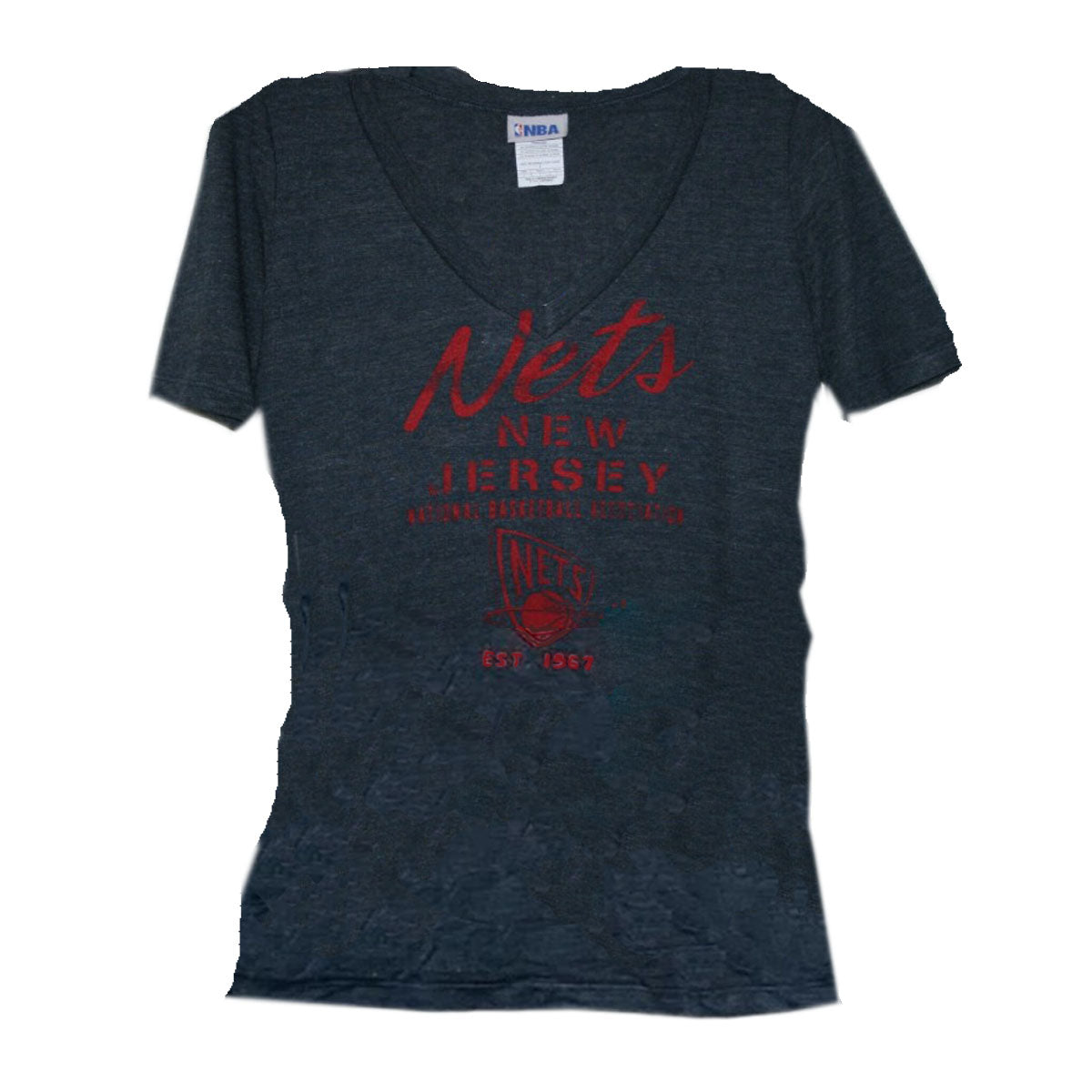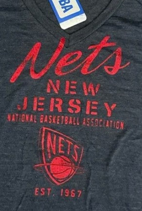 Lightweight womens triblend navy blue t-shirt is extra soft and comfy. The New Jersey Nets team name is printed in red with a combination of cursive and stenciled lettering. The teams logo is printed beneath the name.