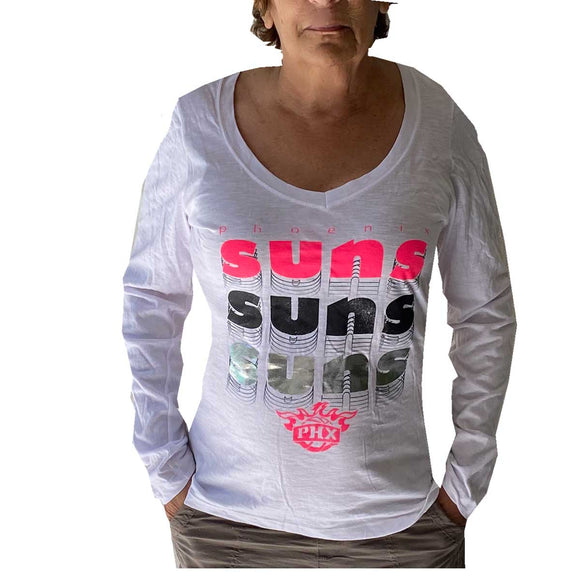 Ladies, everyone will know that you're a Phoenix Suns fan in this white long sleeve t-shirt. There's no missing the giant pink florescent and shiny silver SUNS lettering on the front. Comfy relaxed fit light-weight cotton shirt.