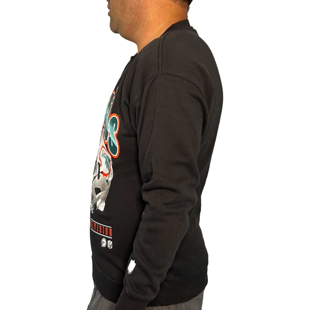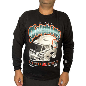 This men's pullover sweatshirt displays a bold graphic of the Miami Dolphins helmet, embellished with the team name and "Eastern Conference" text. Size: Medium Material: Cotton Armpit to armpit = 20" Shoulder to Hem = 28"We Also Recommend