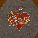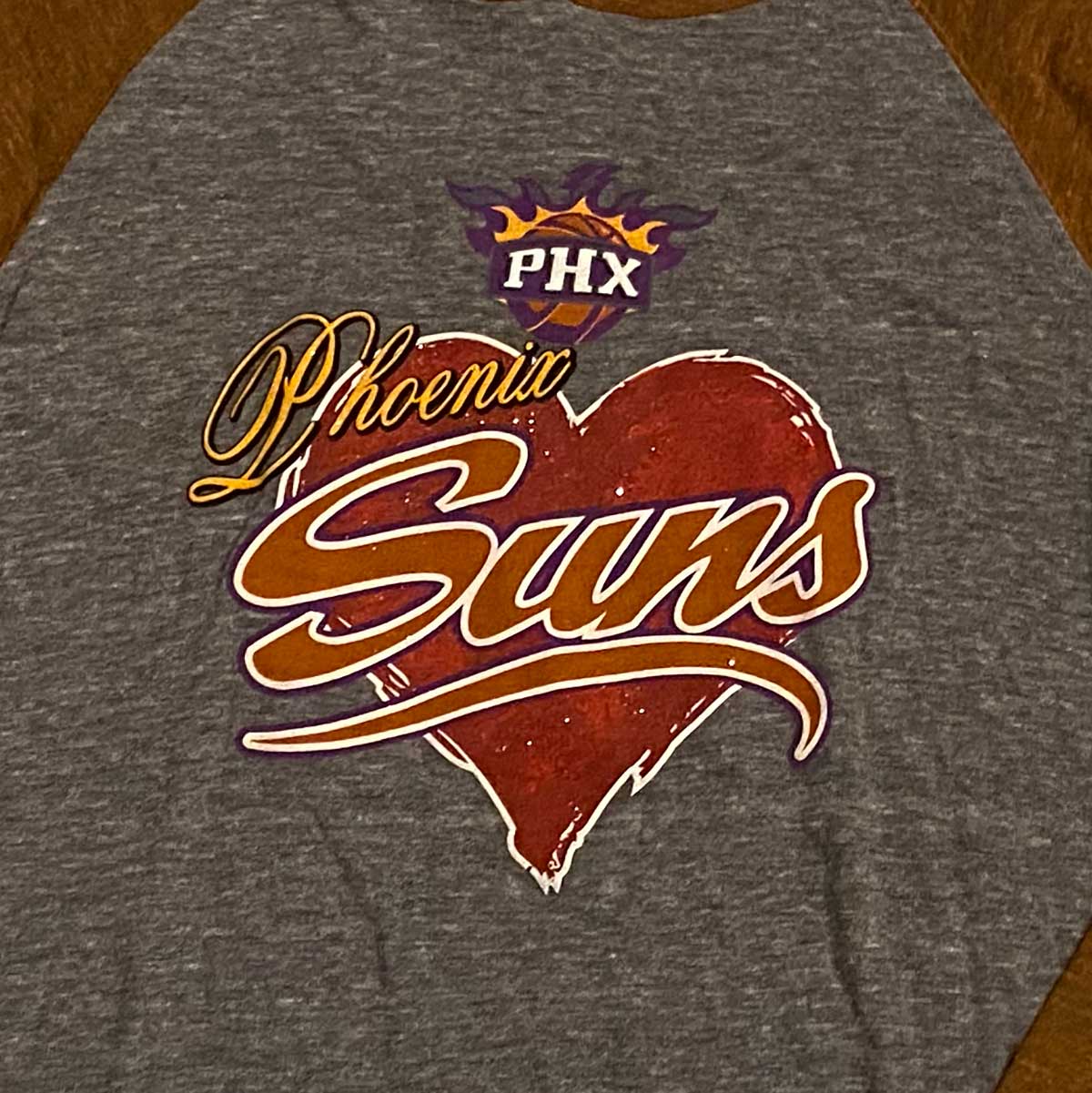 Womens two toned hooded t-shirt has a gray body with bronze raglan sleeves. This light weight pullover hoodie has a large heart printed on the front with Phoenix Suns printed in cursive lettering. Pair this shirt with jeans and a tee shirt and wear it to a night game or out on a date. Color: Heather gray & bronze Size: Small Material: 50% Polyester, 37% Cotton, 13% Rayon Care: Machine wash, cold water Made in: Dominican Republic of US componentsWe Also Recommend