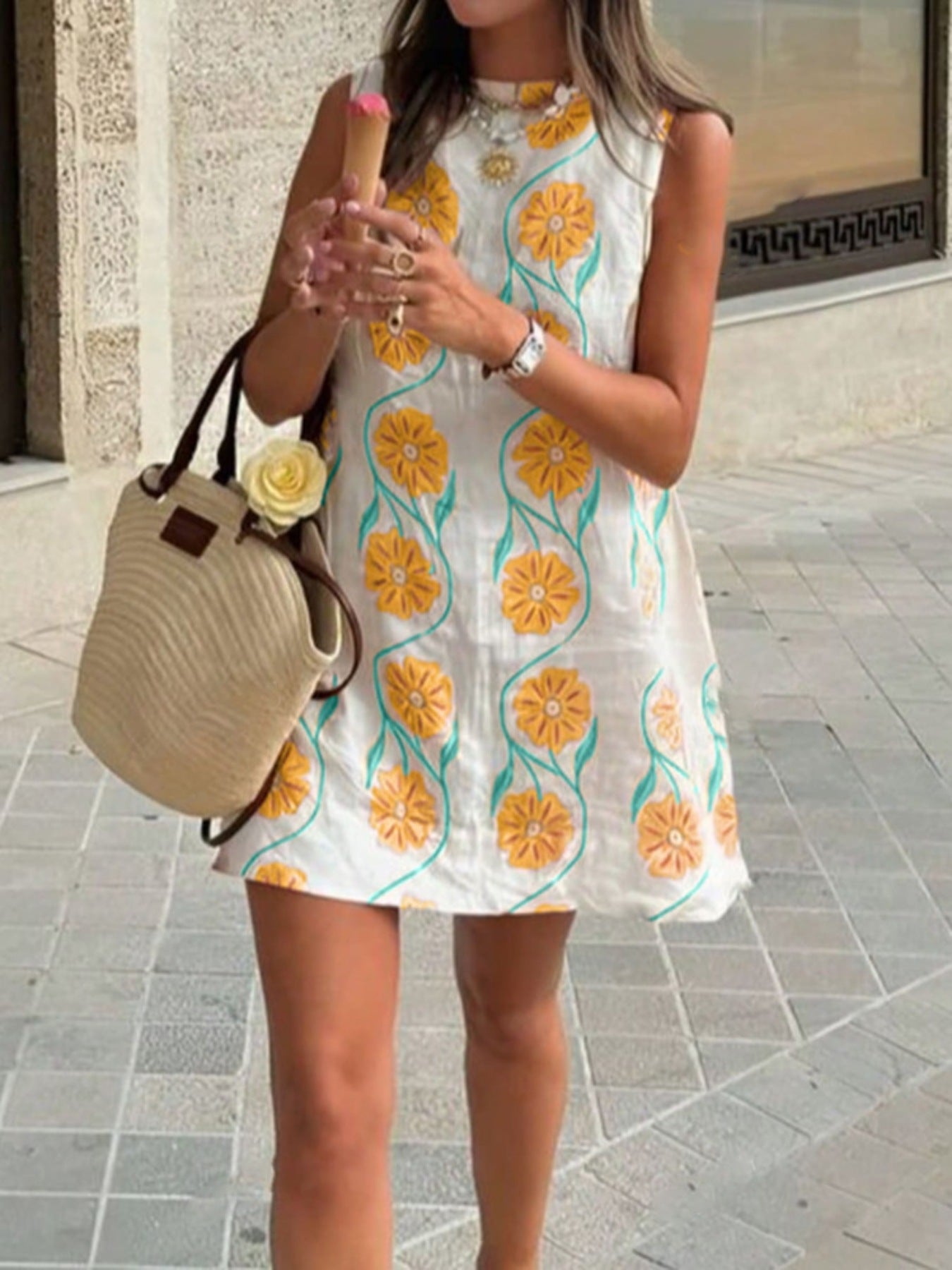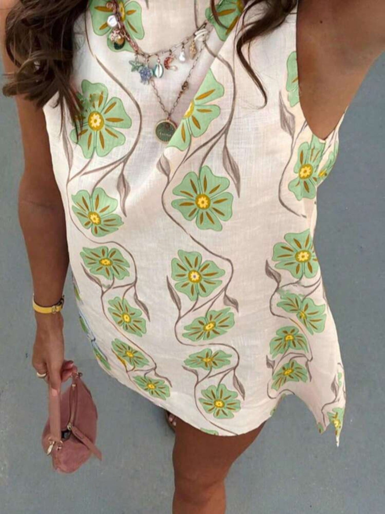 Unleash your inner flower child with this Floral Pattern Sleeveless Mini Dress! Made from 100% polyester (no stretchy business here), it’s perfect for twirling at picnics or just pretending you’ve stepped out of a garden party. Just toss it in the wash and you're ready to frolic again!
