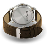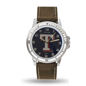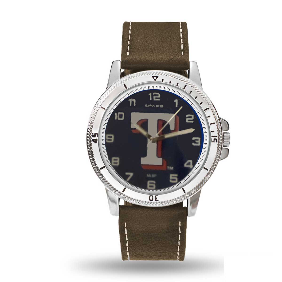 Classic Men's Sports watch by Rico features a stitched brown leather band with silver bezel and stainless steel case back. The watch face is blue with a large Texas Rangers logo. This handsome watch makes a great gift for any fan!
