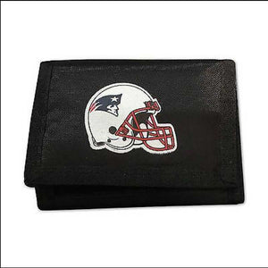 This New England Patriots men or boy's black trifold wallet is screen printed with the New England Patriot helmet logo on the front and the NFL logo on the back. It is made of durable nylon with a Velcro closure, 3 credit card pockets, clear plastic identification window and money compartment.