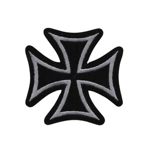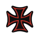 Black velveteen iron cross with white or red embroidered trim. This patch comes in several sizes to iron or sew-on to jackets, bags, hats, shirts, or any other cloth object. Heat-sealed backing for easy iron-on application.
