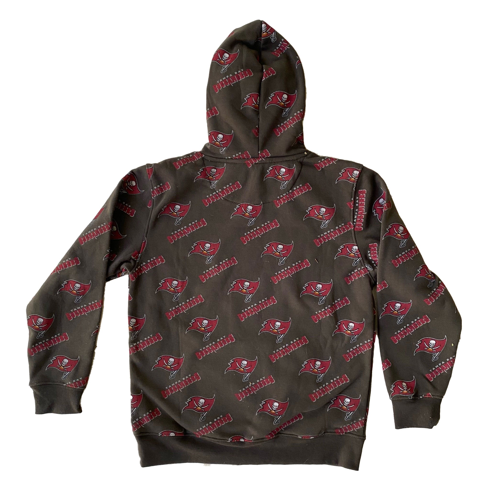 Boys activewear Tampa Bay Buccaneers hoodie. Heavyweight brown hooded sweatshirt with "Tampa Bay Buccaneers" and team logo printed all over. Brown lined hood, ribbed cuffs and ribbed waistband. Pouch pockets in the front. Matching sweatpants available.