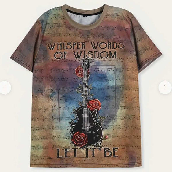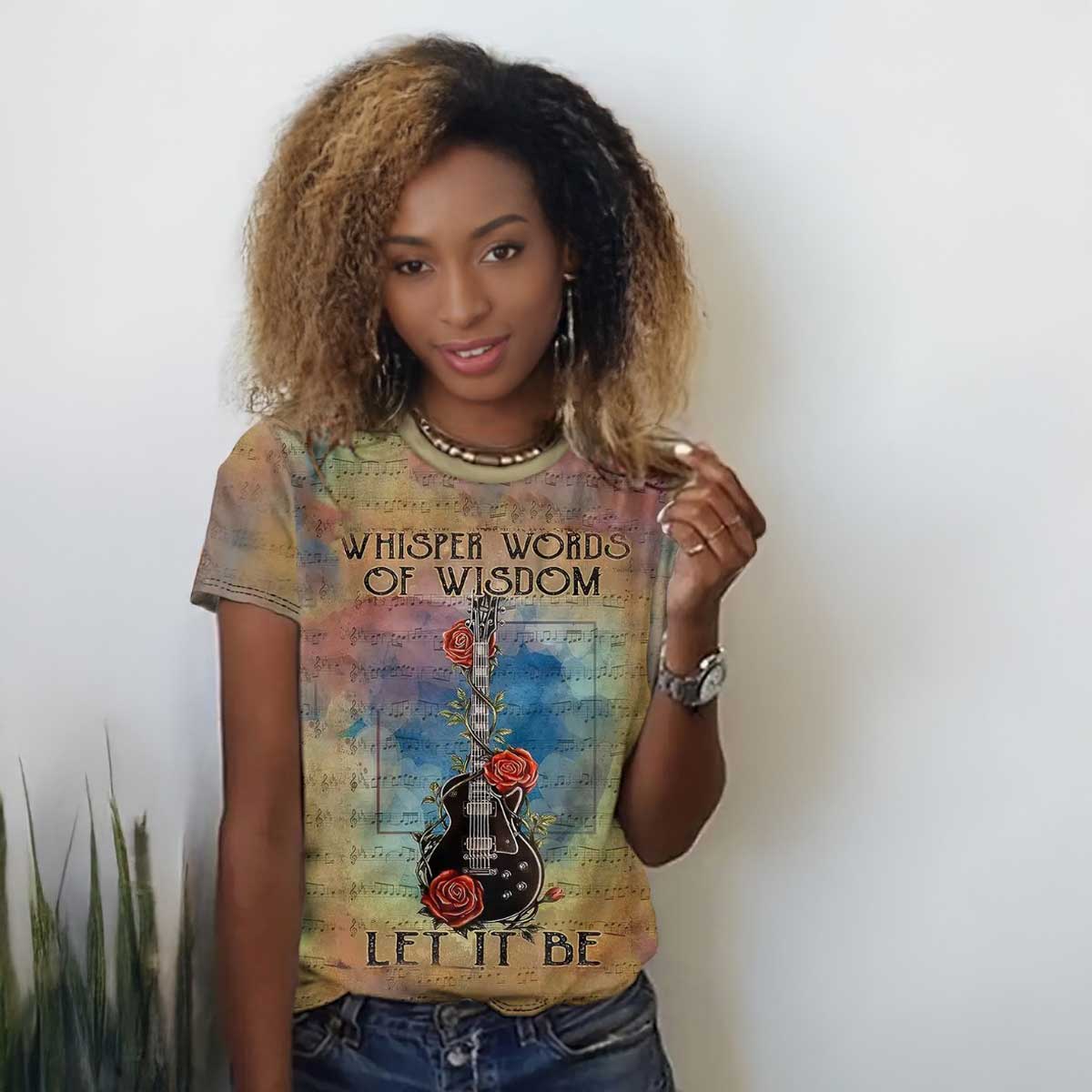 In the center of the shirt is an electric guitar entwined with roses and vines, adding a romantic rock vibe. The focal text above and below the guitar reference the iconic Beatles song "Let It Be," suggesting a message of peace and acceptance.