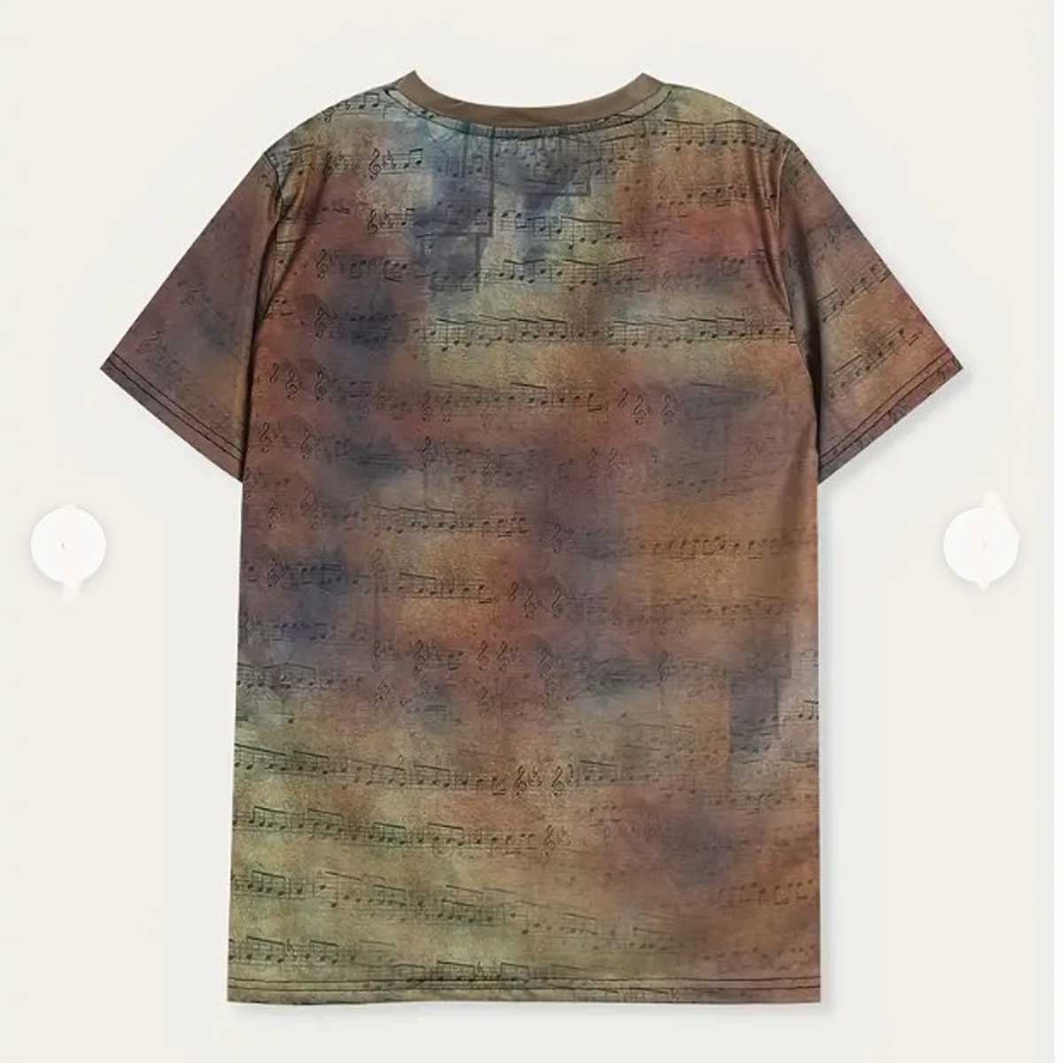 This t-shirt has a vintage, artistic aesthetic with a music-themed design. The background features faded sheet music printed across the entire shirt, giving it a textured, distressed look in tones of brown, blue, and maroon.