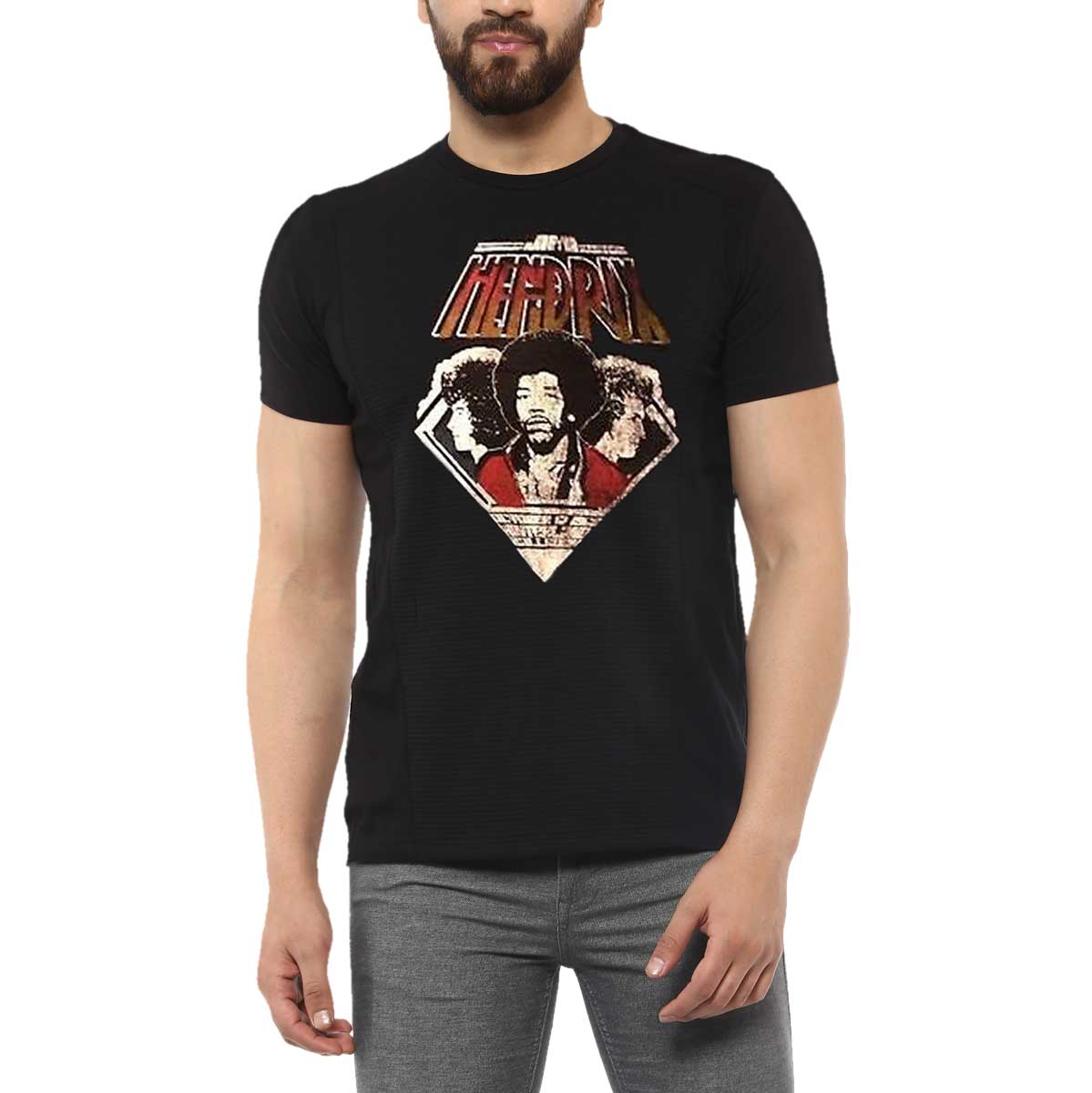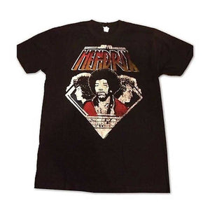 This black t-shirt celebrates the Jimi Hendrix Experience, which consisted of Jimi, Noel Redding and drummer Mitch Mitchell. The band toured from 1966-69 and released three albums, Are You Experienced, Axis: Bold as Love and Electric Ladyland.