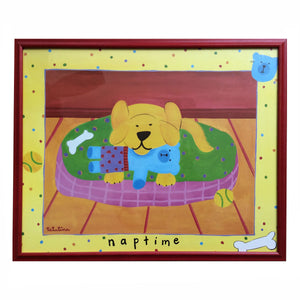 Colorful art print is perfect for children's' room. The colorful art print is surrounded by a red wooden frame, and is encased in Plexiglas to protect it from dust and fingerprints. Ready for hanging.