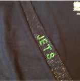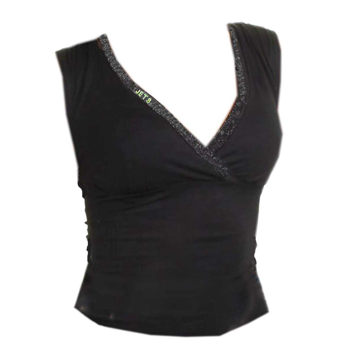 Show your love of the Jets and flaunt your fashion savvy at a watch party, sports bar, or just watching the game on TV. This sexy black wrap shirt has silver sparkles on the trim around a plunging v-neck. The trim is embellished with the Jets team name in bright green shimmering gemstones.