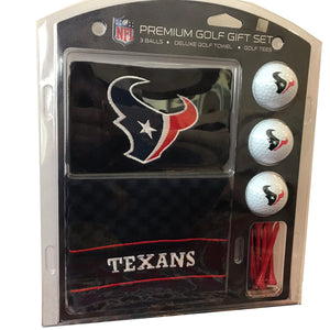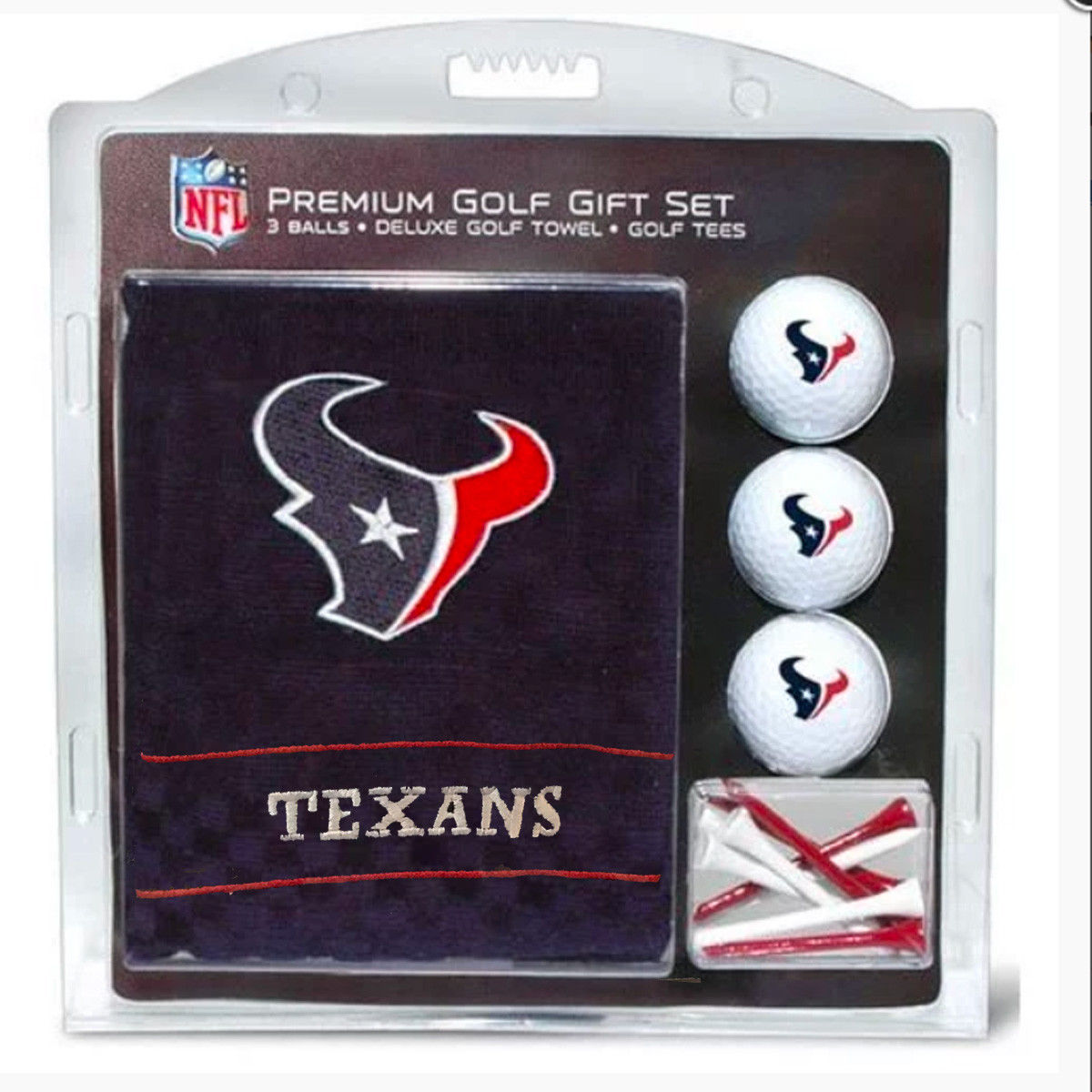Houston Texans Premium Golf Gift set includes deluxe golf towel, tees and three golf balls with team logos.