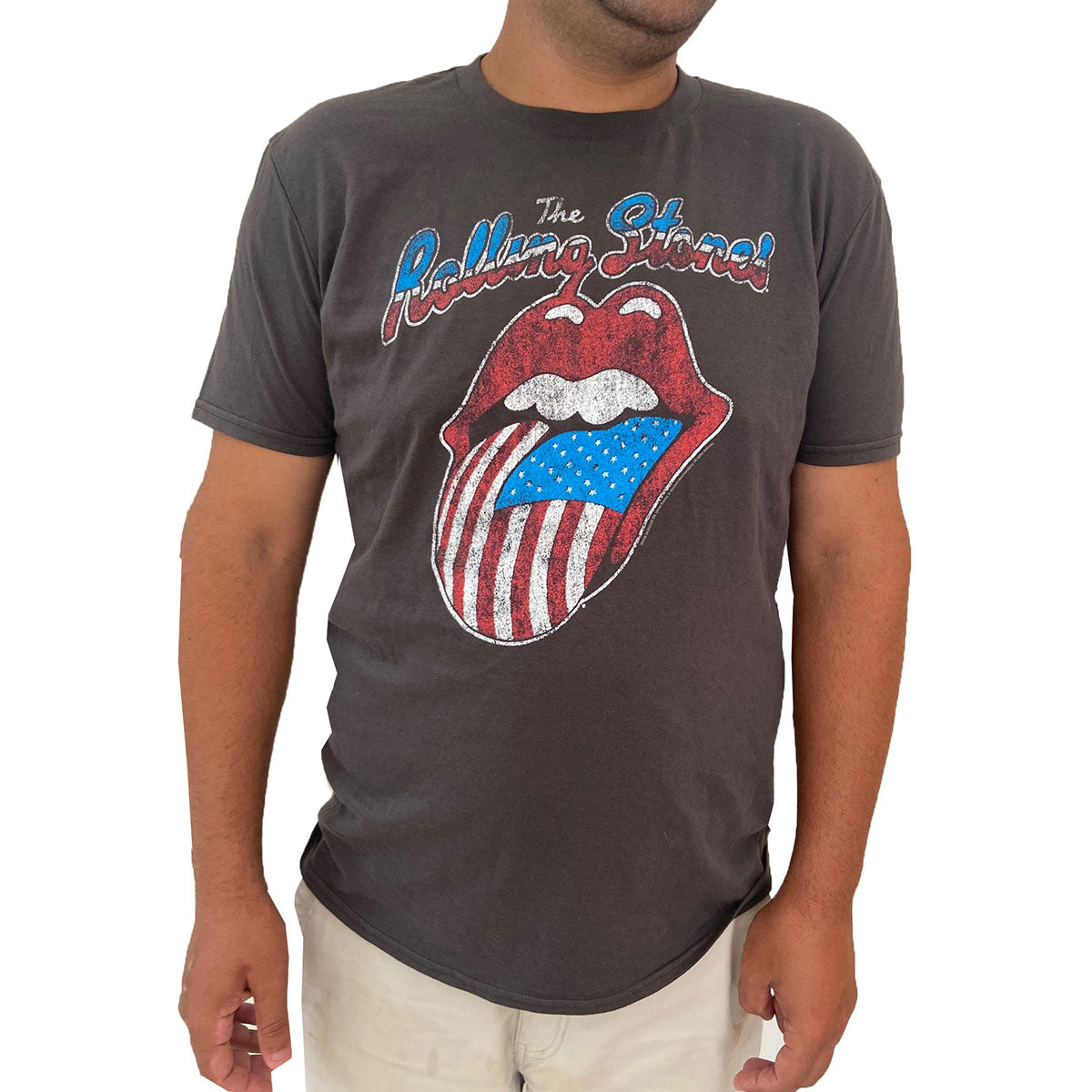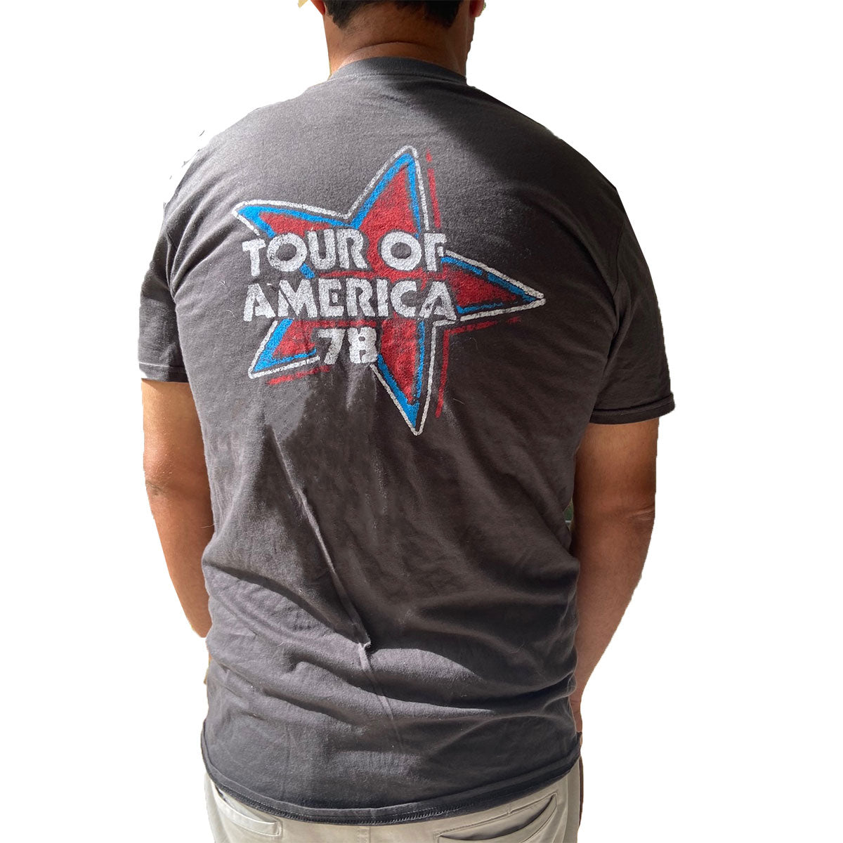 The Rolling Stones iconic tongue logo with American flag is printed in distressed style on the front of this very soft dark gray t-shirt. A large star with Tour of America 78 is on the back.