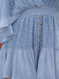 Experience the magic of this ultra-feminine Ruffle Hem Tie Back Lace Mini Dress. The delicate lace and smocked details add a romantic touch, while the low v-neck and butterfly sleeves accentuate your natural beauty. The flirty ruffled hem and tie in the back add a touch of playfulness to this elegant piece. With a comfortable lining, you can confidently wear this dress all day and night. Indulge in the sweet and stylish charm of this dress and turn heads wherever you go!