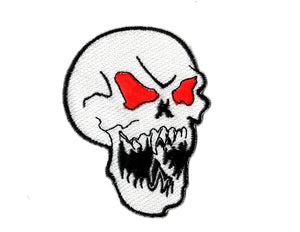 White embroidered iron on patch has red outstanding eyes. This unusual skull patch measures three inches by three and half inches.We Also Recommend