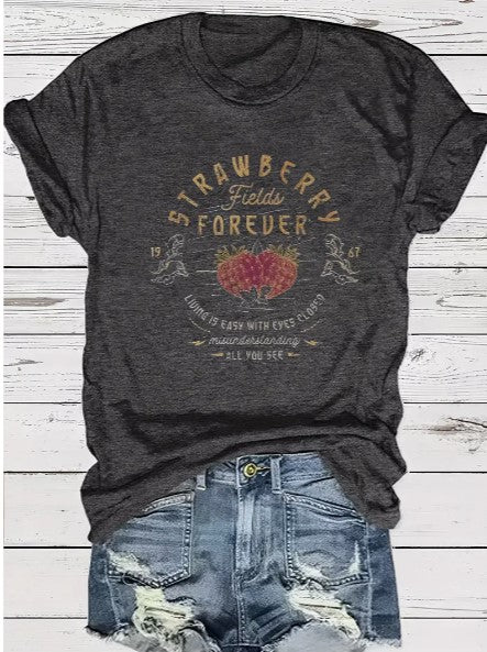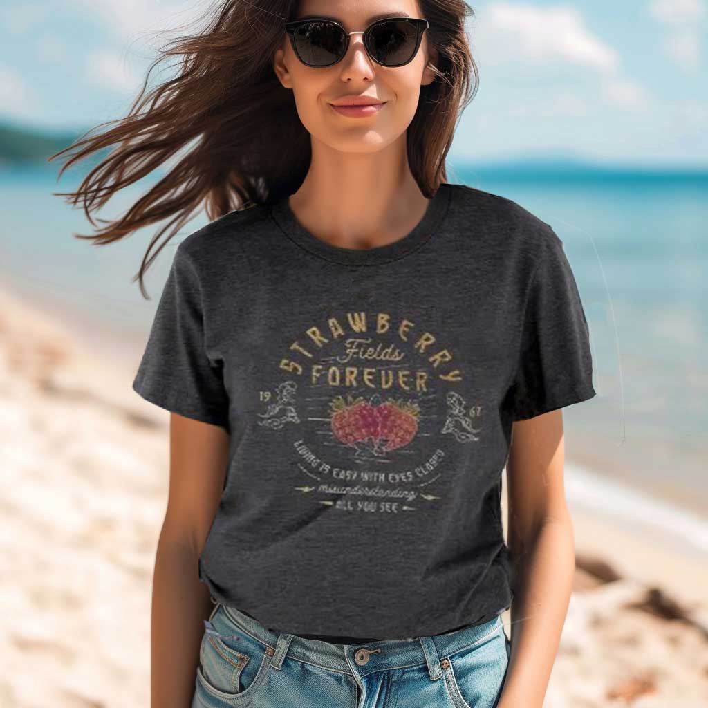 Add a dash of playfulness to your wardrobe with our Strawberry Fields Women's t-shirt. Featuring lyrics from The Beatles' iconic song printed in gold lettering; surrounding an illustration of strawberries. Perfect for music lovers or as a gift.