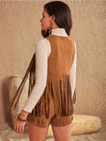 Saddle up in style with this Cowgirl-inspired two-piece vest and shorts set. The fringed vest features a diamond design on the front and long fringes that reach the bottom of the shorts. The shorts have a lace-up closure, and their short fringes add a touch of layfulness. Yeehaw!