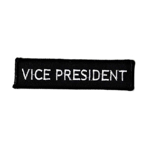This is a Vice Presidents embroidered iron on patch. The patch measures 4 across and 1 down. The lettering of the patch is white and a black background. The patch can be sewn on or iron on. The patch is great for shirts,hats,bags,etcWe Also Recommend