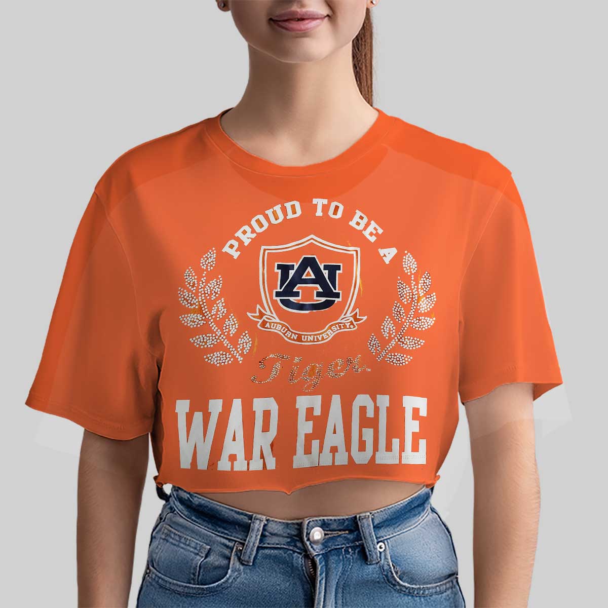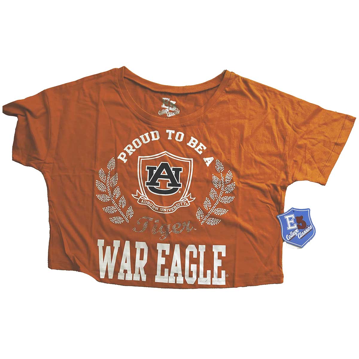 This women's E5 College Classics Auburn University crop top showcases the AU logo. The cropped orange shirt has short sleeves and a crew neck design. The team's moniker "Tigers" is adorned in dazzling bling, with their battle cry "War Eagle" printed prominently at the hem.